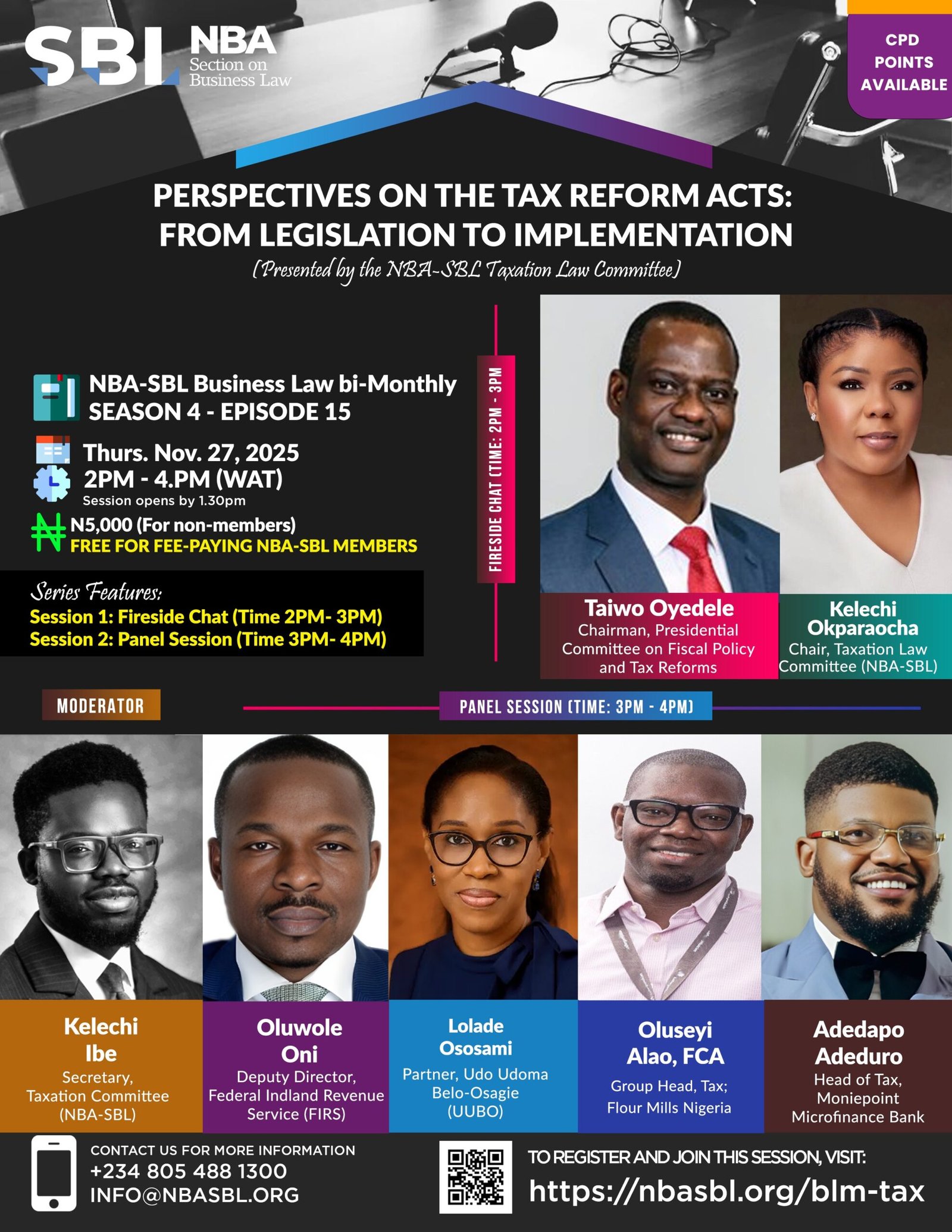 Your registration for the Nigerian Bar Association Section on Business Lawbi-Montly Webinar Series for the Taxation Law Committee was successful. An automated email containing your receipt of payment will be sent to you shortly.
